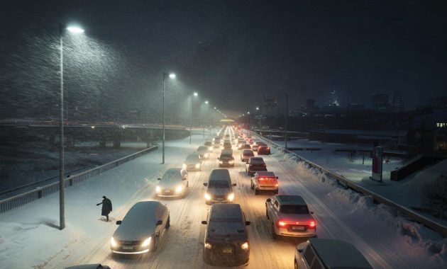 Cars half-buried, delivery trucks sitting crooked in the slush, their hazard lights blinking into the whiteout like tired eyes. Somewhere